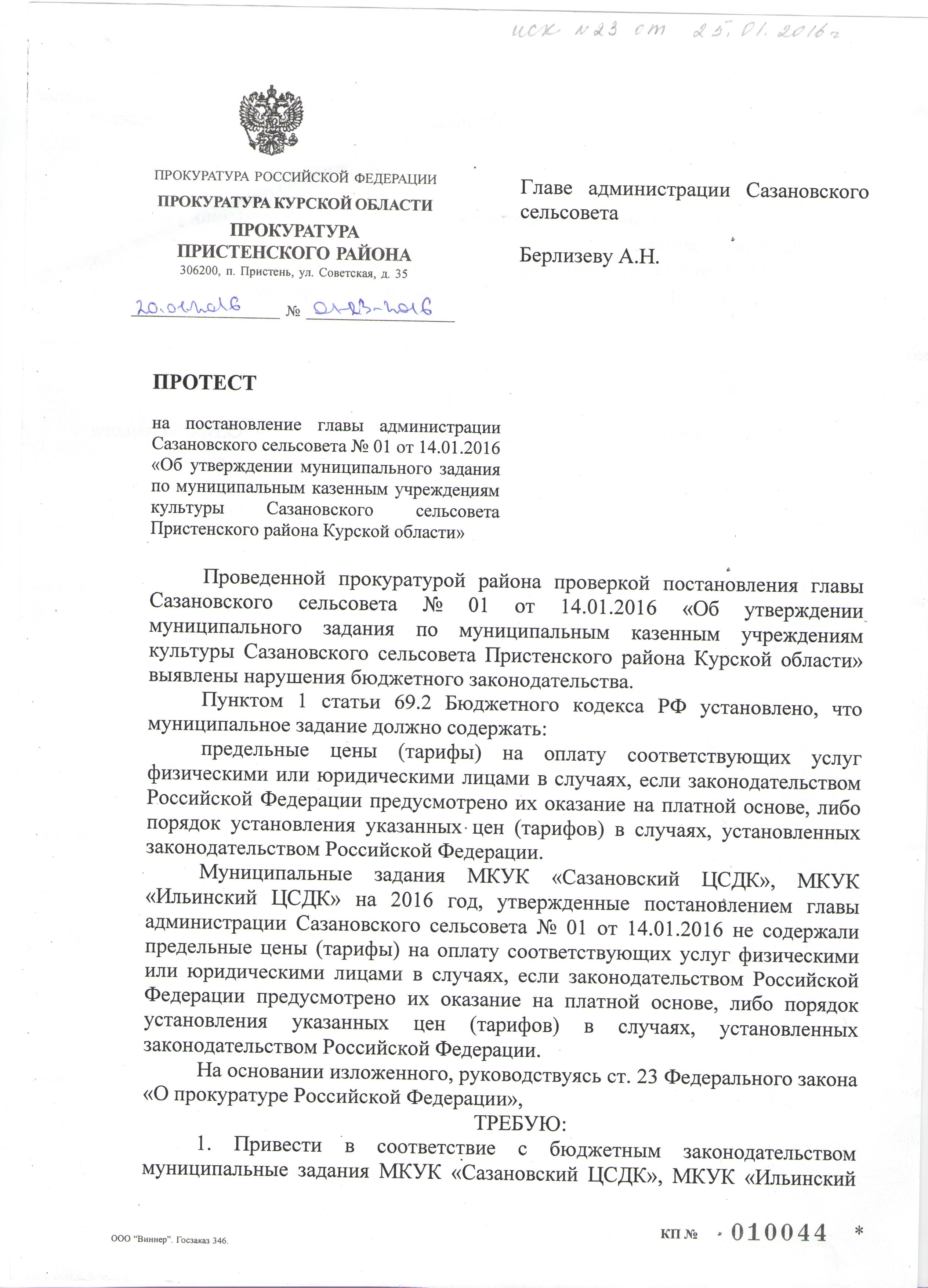 Протест № 01-23-2016 от 20.01.2016